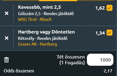 - Grazer AK – Hartberg: Grazer AK a Hartberget fogadja a grazi Merkur Arénában. A két csapat közül egyértelműen a vendégek tűnnek esélyesebbnek, hiszen jobb formában vannak, előkelőbb helyet foglalnak el a tabellán, és az egymás elleni múlt is őket igazolja. A hazaiak támadójátéka az utóbbi időben szinte teljesen eltűnt, ami megkönnyítheti a vendégek dolgát. A tabellán Hartberg a 2. helyet foglalja el, míg Grazer AK csak a 4. pozícióban áll. A szezon során Hartberg 7 győzelmet aratott, míg Grazer AK mindössze 4-et. Ráadásul a graziak 13 vereséget szenvedtek el, míg Hartberg csak 10-et. A gólkülönbségek is sokatmondóak: Grazer AK mérkőzésenként 1.08 gólt szerez és 1.77-et kap, míg Hartberg átlagosan 1.15-ször talál be és 1.42-szer kapitulál. Ez a kisebb különbség is jelzi, hogy a vendégek valamivel hatékonyabbak támadásban és kevésbé sebezhetőek védekezésben. A közelmúltbeli forma is Hartberg fölényét támasztja alá. A Grazer AK az utolsó 5 mérkőzéséből csak egyet nyert meg, kétszer kapott ki és kétszer döntetlent játszott, miközben átlagosan mindössze 0.2 gólt szerzett, ami rendkívül alacsony szám, főként hazai csapathoz képest. Eközben Hartberg ugyan szintén kétszer kikapott, de kétszer győzött is, egy döntetlennel. A Hartberg a papírforma szerint és az aktuális forma alapján is esélyesebb a győzelemre Grazban. A Grazer AK gyenge támadójátéka, rossz formája és az egymás elleni negatív mérlege miatt nehéz elképzelni, hogy meglepetést okoznának. A Hartberg kiegyensúlyozottabb teljesítménye, több rúgott gólja és jobb helyezése alapján inkább vendégsiker várható, de legalábbis nem kap ki a vendégalakulat! Tipp: X2