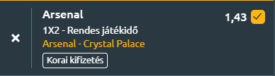 Ezek az ötletek kiválóan alkalmasak arra, hogy egy kétmeccses duplázóban az egyik tagot adják. Az odds alacsonyabb, viszont ezzel párhuzamosan a kockázat mértéke is csökken. Bár a bajnoki cím reménye már tovattűnni látszik, az Arsenal nem akarja elengedni a matematikai esélyt sem. Ezért mindenképpen motiváltak lesznek a mai bajnokin. A Palace legutóbb nem volt meggyőző, de semmiképpen nem szabad félvállról venni.