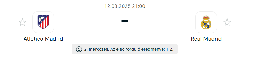 - Az Atlético Madrid nehéz helyzetből várja a visszavágót, miután az első mérkőzésen 2-1-es vereséget szenvedett a Bernabéuban. Ugyanakkor a történelmükben már többször sikerült hazai pályán hátrányból fordítaniuk a Bajnokok Ligája egyenes kieséses szakaszában, legutóbb tavaly az Inter ellen. Diego Simeone együttese kiváló hazai mérleggel rendelkezik Európában, hiszen már 18 mérkőzésen nem szenvedett vereséget a BL kieséses szakaszában saját közönsége előtt! A Metropolitano Stadionban tapasztalt hangulat és az Atlético harcias játéka mindig nehéz perceket okozott a Real Madrid számára, és ez most is kulcsszerepet játszhat. A hétvégén a La Ligában egy fájdalmas vereséget szenvedtek a Getafe ellen, annak ellenére, hogy az utolsó percekig vezettek. Ez a botlás megingathatja a csapat önbizalmát, főleg, hogy a bajnoki címért folytatott versenyben is hátrányba kerültek. A Real Madrid ellen ráadásul nincs jó emlékük az európai kupasorozatokban, hiszen eddig mindig alulmaradtak a városi riválissal szemben.