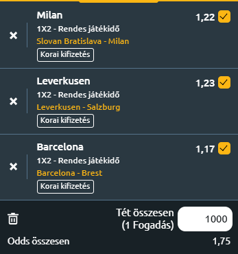 - Slovan Bratislava - AC Milan: A Milan két vereséggel kezdte a BL-szezont, de azóta javítottak formájukon, különösen a Real Madrid elleni 3-1-es idegenbeli győzelemmel. Ez a siker, valamint a Club Brugge elleni 3-1-es diadal révén a Rossoneri a rájátszást érő helyen áll négy fordulóval a vége előtt, mindössze három ponttal lemaradva a legjobb nyolctól. A csapat támadójátéka ugyanakkor hullámzó, amit a Juventus elleni gól nélküli döntetlen és a Cagliari elleni 3-3-as mérkőzés is jól példáz. A csapat csak nyolc győzelmet aratott az utóbbi 25 meccsén, és a Serie A-ban mutatott teljesítménye az elmúlt öt év leggyengébb rajtját hozta. Bár a hazai bajnokságban szenvednek, a Bajnokok Ligájában még esélyük van az egyenes kieséses szakaszba jutni. A Slovan nem BL-szint. Négy vereség, két rúgott gól és -13-as gólkülönbség jellemzi őket. Otthon dominánsak, de a BL-ben nulla esélyük van. Legutóbb a Dinamo Zagreb ellen szenvedtek súlyos, 4-1-es vereséget, és Milan után még az Atlético Madridot és a Bayern Münchent is fogadják majd, ami újabb súlyos vereségeket eredményez majd, hiszen az idei kiírásban már kiemelten fontos szerepe van a góloknak is! Nem kérdés, hogy nyer a Milan ma!