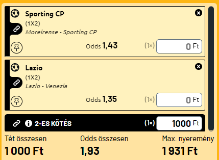 - Olaszországból és Portugáliából hoztam egy-egy bajnokit a mai szelvényre, ami majdnem dupláz. A Lazio az újonc Venezia ellen lép fel Rómában. A meccs és az összes bajnoki pont nagyon fontos a Laziónak, hiszen az 5. és 6. helyre (a két nemzetközi meccset érő helyezésre) vannak négyen, akik nagyon szorosan állnak és nagyon nehéz még csak megjósolni is, hogy melyik két csapat lesz a befutó. Az AS Roma, az Atalanta, a Lazio és a Fiorentina is ott nyomul és eltökélt célja hogy nyáron a nemzetközi kupában indulnak. Ehhez viszont minden egyes kötelező pontot hozni kell. A Venezia nem kezdett rosszul, sőt a bajnokság több időszakában voltak jó meccseik, de mára kezd kialakulni a valós erőviszony. A Venezia már a 18. kieső helyen áll. A Laziónak hazai körülmények között meg kellene szerezni a győzelmet.