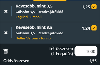 - Cagliari – Empoli: Nehezen rajtolt a szárd alakulat a bajnokságban idén. A legutóbbi két meccsét egyaránt elveszítette, és négy meccsen eddig mindössze egy gólt szerzett. A múlt héten a szardíniaiak hazai pályán 4-0-ra kikaptak a Napolitól tükörsimán, előtte pedig a Lecce is elverte őket. Ez a gyenge eredmény azt eredményezi, hogy jelenleg utolsó-előtti helyen állnak, csak a velencei gondolásokat előzik meg. Azonban a Cagliarira ez a nehéz kezdés általánosan jellemző! Az elmúlt két élvonalbeli bajnoki idényében mindkét alkalommal az első öt bajnoki mérkőzéséből egyet sem tudott megnyerni. Davide Nicola vezetőedző most joggal várja már, hogy véget érjen a balszerencsés időszak és kijöjjön az a minőségi szint, ami bennük van. Erre ma kiváló lehetőség adódik, hiszen az Empoli az élvonal gyengébb csapatai közé tartozik. Már tavaly is majdnem kiestek. Viszont idén remekül kezdtek! Előbb továbbjutottak a kupában, majd az első négy bajnoki meccsen hármat sikerült X-re menteni. Tőlük ez sikernek számít. Mondjuk ebben benne volt a Juventus és a Bologna is, valamint megverték az AS Romát! Hát mi folyik itt Empoliban? Ma is betonos védekezés az Emplitól és a szenvedés a Cagliaritól. Nem várhatunk túl sok találatot! Kevesebb, mint 3,5 gól a tippem.