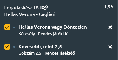 - Mire következtethetünk mindezek alapján? A helyzetkép alapján szoros, kevés gólos mérkőzésre számíthatunk, ahol a védekezésen lesz a hangsúly. A Hellas Verona hazai pályán évek óta dominál a Cagliari ellen, ráadásul formájuk is stabilabb, mint a vendégeké. Cagliari támadásban rendkívül gyenge idegenben, és most a legjobb gólszerzőjük sem lesz ott a pályán, ami tovább csökkenti az esélyeiket. 1X és kevés gól a tipp.