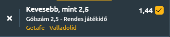 - A mérkőzésen két, támadásban gyengén teljesítő csapat találkozik. A Getafe a szezon egyik legrosszabb támadócsapata mindössze nyolc szerzett góllal, míg a Valladolid védelme a leggyengébb a mezőnyben, de az ellenfél gyenge helyzetkihasználása miatt kevésbé kell tartania egy gólesőtől. A Getafe védelme ugyanakkor stabil, hiszen csupán 11 gólt kaptak eddig, ami a bajnokság legjobbjai közé tartozik. Ez azt jelenti, hogy a Valladolid támadósorának is nehéz dolga lesz, különösen idegenben. Az elmúlt találkozók eredményei is azt mutatják, hogy a két csapat összecsapásai jellemzően kevés gólt hoznak, legutóbb például gól nélküli döntetlennel zárultak. Mindezek alapján egy alacsony tempójú, taktikai csata várható, amelyben a védekezés dominál majd és nem lesz két gólnál több a találkozón!