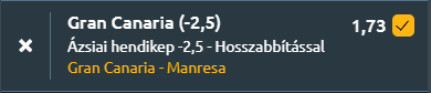 - A Gran Canaria számára kulcsfontosságú ez a mérkőzés a rájátszásért folytatott küzdelemben, ráadásul az EuroCup-negyeddöntős sikerük után új lendületet kaphattak. Ezzel szemben a Manresa idénybeli legrosszabb formájában van, hiszen az utóbbi öt mérkőzéséből négyet elveszített. Mindezek fényében valószínű, hogy Gran Canaria hazai pályán győzni fog, kicsi hendikepről is el lehet indítani!