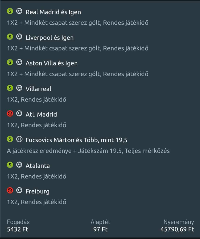 - Nem jött meg telibe, csak az egyik. A másikon úgy látszik, rosszul mértem fel az Atleticót meg a Freiburgot, az elemzéseim alapján jönniük kellett volna, de nem jöttek. Sajnáltam, mert ha jön az a két meccs is, akkor félmilliót hozott volna a szelvény, ötezerre. A 6/8-as gólváltós szelvény viszont lejött telibe. Ne gondoljátok, hogy ez akkora varázslat. Rengetegszer olvastam itt, hogy ez lehetetlen, képtelenség, értelmetlen, felesleges. Dehogy az. Hülyének nézel, ha azt mondom, ez benned is megvan? Mert természetesen megvan. Csak rá kell szánni az időt. Tarthatsz bárminek, nevezhetsz bárminek, de nem tudod elvenni tőlem a jogot, hogy tudjak hinni abban, amiben te nem tudsz, vagy ti nem tudtok. Ha impulzívan játszol, akkor - hangsúlyozom, szigorúan az én véleményem szerint - sosem leszel sikeres. Lesznek jó pillanataid, pont ettől fogod szerencsejátéknak tartani. Esküszöm, szíved joga. Nem foglak győzködni, egyszerűen nincs jogom hozzá, rád, rátok erőltetni meg végképp nem fogom a saját metodikám. Ha annyit el tudok érni, hogy őszintén magadba nézz, és feltedd magadnak a kérdést, hogy biztosan helyes metodika szerint játszol-e, nekem már megérte.