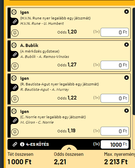 - A három főmeccsem segítségével létrehoztam egy 1,77-es szelvényt, aminek a kockázata elég alacsony! Rublev győzelme nagyon erős esély a miértekre ITT (katt-katt) lehet választ kapni!