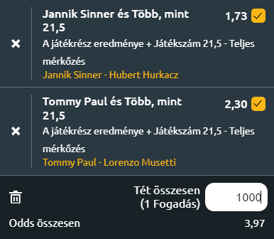 Nagyon jók a tippek, természetesen sima papíron Sinnernél már 23,5 a játék.. :D Bár Pro-n is már 22,5 (nem véletlen a papírozás egyelőre). Emiatt annál a meccsnél még gondolkozok mit hozok ki belőle, lehet játékos játékszámára megyek rá, ott még egész jó lehet a piac. Tommy meccsnél pedig szintén már 22,5 a határ, hogy húzzák magukba..Picit ott jobban hajlok végső győztesre, mint Sinnerék esetében.