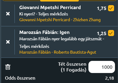 - Roberto Bautista Agut egy rendkívül stabil, védekező alapvonaljátékra építő játékos, aki kiváló labdaérzékével és türelmével tudja felőrölni ellenfeleit. Azonban már nem fiatal, ez a kondíciójára kihat, valamint az utóbbi időben azonban formán kívül van, kevés mérkőzést nyert, és jelenleg önbizalomhiánnyal küzd. Marozsán Fábián ezzel szemben lendületesebb, agresszívabb teniszt játszik, erős ütéseivel és változatos játékszervezésével képes dominálni a labdameneteket. Bár az előző találkozójukon Bautista Agut jobbnak bizonyult, Marozsán azóta fejlődött, és most kedvezőbb helyzetben van. Fábi minimum egy szettet elrak a mai meccsen és én a győzelemre is esélyesebbnek tartom!