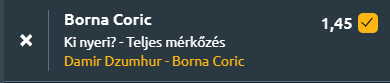 - Borna Coric jóval erőteljesebb, nagyobb ütőerővel bíró játékos, aki kifejezetten jól szervál, erős alapütései vannak. Az egyik leguniverzálisabb játékos, minden borításról van tornagyőzelme! Három ATP tornát nyert (füvön, salakon, szabadtéri kemény borításon), valamint 5 CH-elsőség, salakon és fedett keményen is. Mentálisan erős és kiemelkedően jó formában van! Az elmúlt 10 meccsét mind megnyertek, két CH tornát nyert sorozatban (Lugano, Thionville) és az sem számít neki, hogy ez most salak. Cachin, Mikrut és Jianu ellen egyarán 2-0-ra nyert, rendkívül motivált és magabiztos. Dzumhur még a tenisztudásával meg tudná szorongatni Coricot, sőt már nyert is ellene korábban, de mentálisan nem fogja bírni. Ráadásul Coric hazai játékos, neki fog szurkolni mindenki. Ez pedig már sok lesz Dzumhurnak.