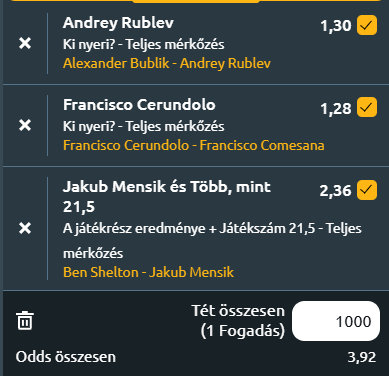 - Mindkét játékos ereje inkább a gyors borításokon jön ki. Salakon egyikük sem kimagasló, viszont Mensik fizikálisan erősebb lehet hosszú labdamenetekben, és univerzalitásban is jobb, mint az amerikai, aki viszont adogatásban erősebb, így itt kompenzálhat. Szoros meccs várható, amit szerintem a cseh játékos nyerhet meg. Mensik nyer és legalább 22 game lesz a meccsen! Ez a meccs single is megállja a helyét, én összeraktam a hármat.