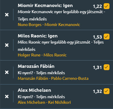 Köszönjük a tippeket, részemről Michelsent és Fábit viszem, nekem elég lehet, de azért megnézném ki, mit gondol mára. Hirtelen belenézve láttam egy Topo - Marterer mérkőzést Bonn-ból..végignézve a statot eléggé más szinten mozog a két játékos és 1,4-ért szerintem megérheti Marterer.