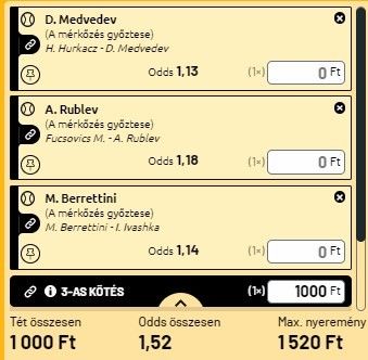 Medvedev kiváló formában van, olyannyira megy neki a játék, hogy az alapjában kiváló Hurkacz elleni is csak 1,13-at adnak a győzelméért.