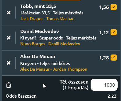 - J. Draper – T. Machac: Két-, már a 2000-res években született ifjú, mindkettő nagyon tehetséges teniszező. Draper magasabb, komolyabb ütőerő van benne, kifejezetten a gyors pályaborításokat szereti. Kiváló szerva, erős tenyeres. Még fiatal, így a játéka ingadozó még, de alapvetően mentálisan is jó lesz. Machac alacsonyabb, mozgékonyabb és technikai téren is erősebb. Kiváló fonákot üt, jól fogad és mentális téren ő is erős. A forma is egészen jó mindkettőnél. Mindenképpen hosszabb meccset várok! Tipp: több mint 33,5 game – 1,56