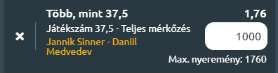 A mixemen Draper-De Minaur és Sinner-Medve meccs 3,5+ szett, csak itt nem lehet ilyen kiválasztani (úgy azért kicsit erősebb 3,42es oddsz)