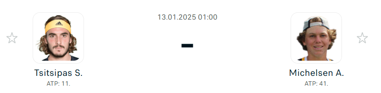 Az Ausztrál Open első fordulójában egy feltörekvő és egy lefelé csúszó játékos találkozik ma. Az egykori harmadik helyezett görög Stefanos Tsitsipas ma már csak a 11. helyen áll, míg a még mindig csak 20 esztendős Alex Michelsen rakétaként tör fel a világranglistán. Már a 40. helyen áll, kiváló formában van és kemény borításon ő egy igazi erőgép! Remek meccs várható! A meccset, ha nem mossa el az ausztrál első, akkor hétfőn éjjel rendezik.