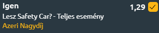 Ehhez képest a szorzó egész magas, hiszen szinte biztosnak vesszük a biztonsági autó pályára gördülését. Az 1.29-es odds 77,5%-os esélynek felel meg.