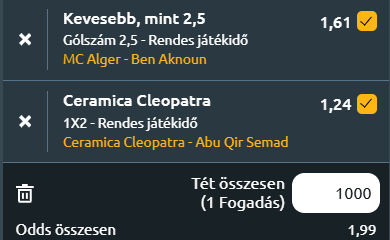 - Ceramica Cleopatra - Abu Qir Semad: Az Egyiptomi Kupában az egyik legerősebb csapat, a Ceramica Cleopatra és az Abu Qir Semad csap össze Kairóban. A Ceramica Cleopatra legutóbb 2–0-ra nyert a Pharco ellen, és kiváló formában van, az utolsó öt mérkőzését egyaránt megnyerte, ezeken átlagosan 2,0 gólt szerzett és mindössze 0,2-t kapott, a támadási hatékonyság jó, a védelem erős! Az Abu Qir Semad legutóbb gól nélküli döntetlent játszott az Alaab Damanhour ellen, az utóbbi öt találkozón két győzelem, két vereség és egy döntetlen a mérlege. Mindezek alapján a Ceramica Cleopatra győzelme esélyes!