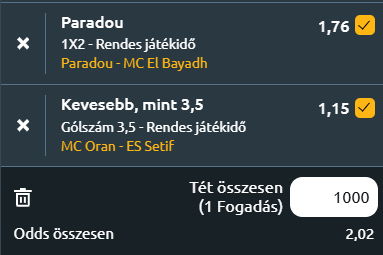 - MC Oran - ES Sétif: Szintén az algériai bajnokság élmezőnyéhez tartozó MC Oran fogadja az alsóházi ES Sétifet a Miloud Hadefi Stadionban. A gólok tekintetében alacsonyabb gólszám várható, hiszen a csapatok az utóbbi tíz meccsükből hétszer zártak kevés gólos eredménnyel. Az MC Oran a legutóbbi öt mérkőzésén három győzelmet aratott, átlagosan 1,4 gólt szerezve és 0,8-at kapva, míg az ES Sétif öt meccsén egy győzelmet szerzett, 0,8-as gólátlaggal és 1,2 kapott gól átlaggal. Az eddigi egymás elleni mérkőzések kiegyenlített eredményei mellett az MC Oran hazai dominanciája és az ES Sétif gyenge gólszerző képessége miatt valószínűsíthető, hogy a találkozón kevés gólt láthatunk.
