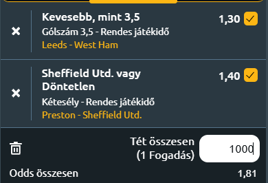 - Leeds - West Ham: A Premier League alsóházában vergődő Leeds és West Ham találkozója inkább a biztonsági játék és a küzdelem jegyében, mintsem a gólzáporról szólhat. Mindkét csapat komoly támadási gondokkal küzd, a Leeds mindössze hétszer talált be nyolc forduló alatt, és Daniel Farke együttese legutóbbi három meccsén csupán egyetlen pontot szerzett. A hazaiak utolsó győzelmük óta több kulcsjátékosuk is sérüléssel vagy betegséggel bajlódik, ami tovább gyengíti a támadóhatékonyságukat, ezért aztán a védekezést kell megacélozni. A West Ham sincs jó formában. Nuno Espírito Santo csapata csupán négy pontot gyűjtött, hatszor kapott ki, és az egész szezonban egyetlen győzelmet tud felmutatni. A fővárosiaknál szintén több kulcsember hiányzik, ráadásul a Brentford elleni 2–0-s vereség után önbizalmuk is megtépázott. A két edző óhatatlanul is a stabilitásra helyezi majd a hangsúlyt, hiszen egyik fél sem engedheti meg magának, hogy újabb súlyos vereséget szenvedjen. A kevésbé hatékony támadósorok, a sérülések és a nagy tét miatti óvatosság egyaránt abba az irányba mutatnak, hogy az Elland Roadon egy feszült, visszafogott, kevés gólt hozó mérkőzésre számíthatunk, ahol bőven reális, hogy nem születik három gólnál több találat.