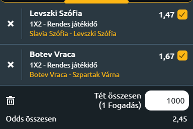 - Szlavia Szófia - Levszki Szófia: Városi rangadót rendeznek ma a bolgár fővárosban, ahol az élvonal listavezetője látogat a hetedik helyezetthez. A Slavia legutóbb 3–1-re múlta felül a Dobrudzha 1919-et, a Levski pedig 7–0-val küldte haza a Septemvrit. A legutóbbi egymás elleni meccsen a Levski 2–0-s hazai győzelmet aratott, és az elmúlt öt találkozójukból négyet is megnyert, egy döntetlen mellett, miközben a Slavia egyszer sem tudott felülkerekedni; az egymás elleni gólátlagok is ezt támasztják alá, hiszen a Slavia 0,6-os, a Levski pedig 2,0-s értéket produkált. A tabellán a Slavia a 7., a Levski az 1. helyen áll. A szezonban a Slavia 6 győzelemmel, 5 vereséggel és 6 döntetlennel 1,18–1,18-as gólátlagot hoz, míg a Levski erősebb mérleggel, 13 győzelemmel, 2 vereséggel és 2 döntetlennel 2,35 rúgott és 0,53 kapott gólos átlaggal vezet. A Levszki esélyességét elsősorban a négy megnyert egymás elleni mérkőzés, a magasabb gólátlagok és a tabellán elfoglalt első helye indokolja, amelyek egyértelmű fölényt jeleznek a városi riválissal szemben.
