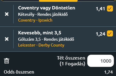 - Coventry – Ipswich: A Championship első és harmadik helyezettje csap össze ezen a meccsen. A Coventry kiváló szezont fut, 23 mérkőzéséből 15-öt megnyert, hat döntetlen és mindössze két vereség mellett 51 ponttal vezeti a tabellát, nyolcpontos előnnyel a második Middlesbrough előtt, legutóbb pedig 1–0-ra győzte le a Swansea Cityt Ephron Mason-Clark találatával. Frank Lampard csapata különösen hazai pályán erős, 11 otthoni mérkőzésen 29 pontot gyűjtött. Az Ipswich 38 ponttal áll a harmadik helyen, mérlege 10 győzelem, nyolc döntetlen és öt vereség, legutóbb gól nélküli döntetlent játszott a Millwall ellen. Kieran McKenna együttese idegenben eddig küszködött, 11 vendégfellépésen csak 13 pontot szerzett és mindössze három győzelmet aratott, ami különösen nehézzé teszi a dolgát a hazai pályán kimagasló Coventry ellen, még akkor is, ha a közelmúltban öt bajnokiból hármat megnyertek és csak egyszer kaptak ki. Szoros, kiélezett mérkőzés várható, ahol a döntetlen mellett a hazai győzelemnek van esélye.