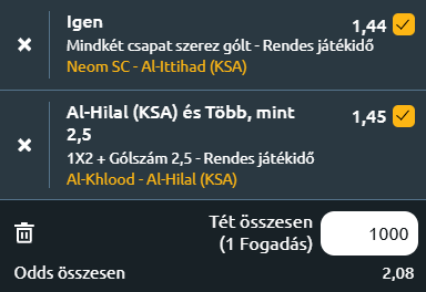 - NEOM SC – Al-Ittihad: Közvetlen riválisok csapnak össze a szaúdi élvonalban, amikor a tabellán azonos pontszámmal álló NEOM SC az Al-Ittihadot fogadja. A NEOM SC újoncként is meggyőzően szerepel a Saudi Pro League-ben, tíz forduló után öt győzelemmel, két döntetlennel és három vereséggel, 17 ponttal a hetedik helyen áll, azonos mérleggel és pontszámmal, mint az Al-Ittihad. Christophe Galtier együttese legutóbb 2–1-re legyőzte az Al Najmát, az elmúlt négy bajnokiján pedig hét pontot gyűjtött, miközben a szezon során 15 gólt szerzett és ugyanennyit kapott. Az Al-Ittihad szintén jó formában érkezik, miután 2–0-ra nyert az Al-Shabab ellen, ami az idénybeli ötödik győzelmük volt. Sergio Conceicao csapata tíz meccs után ugyanúgy öt győzelemmel, két döntetlennel és három vereséggel áll, de csak a hatodik helyet foglalja el, miközben jelentős hátrányban van az éllovas Al-Nassrhoz és a dobogóhoz képest. Az Al-Ittihad idegenben továbbra is veretlen a bajnokságban, két győzelemmel és két döntetlennel négy mérkőzésen. A kiegyenlített tabellahelyzet ellenére az idegenben is stabil Al-Ittihad esélyesebbnek tűnik, ám a jó formában lévő NEOM SC várhatóan szorossá és gólgazdaggá teszi az összecsapást, ahol mindkét csapat betalálhat!