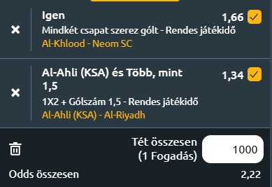 - Al Kholood – Neom SC: Ma este a King Abdullah Sport City Stadion ad otthont az Al Kholood és a Neom SC első élvonalbeli összecsapásának, amely ígéretes, gólgazdag mérkőzésnek ígérkezik a Szaúdi Pro League középmezőnyének két formában lévő csapata között. Mindössze egy pont választja el egymástól a feleket, így mindkét oldalon komoly motivációval készülnek a három pont megszerzésére. Az Al Kholood remek sorozatban van, hiszen az elmúlt hat tétmeccséből ötöt megnyert, legutóbb pedig a Király Kupában aratott győzelmet Ramiro Enrique találatával. A hazaiak támadójátéka hatékony, ugyanakkor védekezésben sebezhetőek, hiszen korábban nyolc egymást követő mérkőzésen kaptak gólt. A vendég Neom SC szintén jó formában utazik Ar Rassba, újoncként bátran és szervezetten futballoznak, ráadásul idegenben különösen eredményesek, hiszen legutóbbi két bajnoki vendégszereplésüket megnyerték. Christophe Galtier csapata rendre látványos, nyílt játékot mutat, amit jól jelez, hogy legutóbbi hat találkozójukból ötön mindkét fél betalált, és gyakran három vagy annál több gól született. A két gárda hasonló erősségű, támadó felfogásuk pedig egyértelműen arra utal, hogy ezúttal is mozgalmas, helyzetekben bővelkedő, többgólos összecsapás várható, ahol mindkét fél betalál majd!