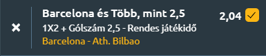 - Az Athletic képes lehet megnehezíteni a Barcelona dolgát, de a katalánok jelenlegi formája, korábbi egymás elleni eredményei és minőségi fölénye, különösen a támadósorban, a hazaiak győzelmét valószínűsítik. Ugyanakkor a vendégcsapat is képes lesz gólt lőni, így legalább három gólt várhatunk.