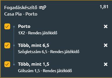 - A tabella élén álló Porto minősége, stabilitása és idegenbeli hibátlan mérlege, szemben a Casa Pia rossz formájával, a védekezési gondokkal, egyértelmű erőviszonyokat rajzol! Magabiztos vendégsiker körvonalazódik, a Porto ebben a formájában minimum két gólt lő, és számtalan helyzetet fog kidolgozni, ezáltal várható legalább hét szöglet is!
