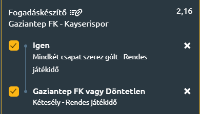 - Kiegyenlített, feszült mérkőzés várahtó, ahol mindkét csapat nyomás alatt játszik, de a Gaziantep jobb helyezése, támadóhatékonysága és kedvező egymás elleni mérlege enyhe fölényt jelent. A Kayserispor győzelmi kényszere veszélyessé teheti a vendégeket, gólra jók lesznek ők is, de a védekezési hibák és gyenge forma miatt inkább a döntetlen, vagy a hazaiak győzelme valószínű.