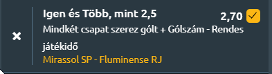 - Rendkívül akciódús, rengeteg támadással megfűszerezett meccs várható! A Mirassol hazai pályán eddig veretlen, támadójátéka lendületes és hatékony, ugyanakkor a védekezése nem mindig stabil, amit a 28 kapott gól is jelez. A Fluminense hasonlóan nyílt stílusban futballozik, kilenc találkozón is betalált az utóbbi időben, de védekezése szintén sebezhető. Mindkét csapat formája támadásban biztató, és egyik sem hajlamos a visszafogott, óvatos játékra. A Mirassol otthoni góltermelékenysége és a Fluminense új lendülete alapján reális, hogy mindkét fél betalál, sőt, a statisztikák és a játékstílusok alapján több gól is várható.
