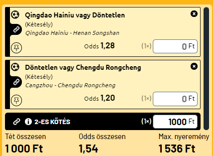 - Cangzhou - Chengdu Rongcheng: A Chengdu Qianbao hétfőn a Cangzhou Stadionban a Cangzhou Mighty Lions ellen próbálja fokozni a nyomást a Kínai Szuperligában felettük álló csapatokra. A házigazdák a hét közepén a veretlen Tianjin Jinmen Tiger ellen elért 1-1-es döntetlen után érkeznek a mérkőzésre, míg a vendégek fontos 2-0-s győzelmet arattak a Henan ellen, így továbbra is a dobogón tartózkodnak. A hónap elején elszenvedett két vereséget leszámítva a Chengdu Qianbao remekül teljesít ebben a szezonban, jó csapatot alkotnak, akik ráadásul a legutóbbi három találkozójukon nem kaptak ki ettől az ellenféltől, így esélyes, hogy ezen a találkozón újabb győzelmet aratnak. De a döntetlen becsúszhat, ezért a szelvény biztonsága érdekében azt is figyelembe veszem.