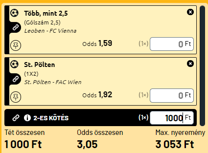 - Leoben - FC Vienna: A Leoben az északi regionalliga bajnokaként jutott fel. Már akkor is ellentmondást nem tűrően szerepeltek, de a másodosztályban sem átszállójegyet akarnak váltani. Az átigazolási és felkészülési időszak jól sikerült, és a rajt is jól sikerült. A First Wienna nem kezdett jól, de tavaly a 7. helyen végeztek és az idei vereségeik alapján sem voltak teljesen gyengék. Sokgólos meccsek voltak, a támadásokkal nincs baj, ráadásul jó csapatokkal is találkoztak! Ezen a meccsen két gólképes csapat találkozik, overes meccset várok.