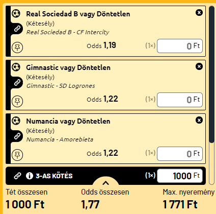 Három esélyes hazait kötöttem össze 1X-ekre. Az eredmény 1,77