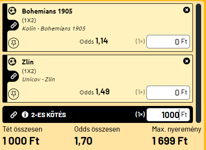 - Unicov – Zlín és Kolin - Bohemians 1905: A Cseh labdarúgó kupából hoztam egy kétmeccses szelvényt az abszolút biztonság jegyében. Mindkét mérkőzésen komoly osztálykülönbség van a két gárda között, olyan differencia ez, amely nem csak a védekezést, hanem a támadójátékot is jellemzi. Csak a hazai rendezés pedig túl kevés ahhoz, hogy itt megforduljanak az esélyek. A Kolin – Bohemians ellen semmi kérdés nincs a vendéggyőzelmet illetően, a Zlín azért nem veheti félvállról a meccset, de ha komolyan veszik, akkor itt sem lehet gond. Két vendégsiker, egy 1,7-es szorzóért.