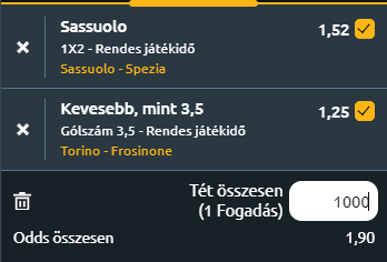 - Torino – Frosinone: A Serie A tabelláján egymás mellett álló Torino és Frosinone csütörtök este találkozik a Coppa Italia második fordulójában. Míg a Toro ötszörös kupagyőztes, addig a Frosinone ritkán jutott tovább az első kupafofordulókon. Ráadásul a bajnokságban is vereséget szenvedtek legutóbb. A Toro jól védekezik, de már négy egymást követő mérkőzésen nem talált a hálóba, és a hétvégén azzal a feladattal utazott Leccébe, hogy véget vessen az egy hónapja tartó góltalanságnak. Csak egyet sikerült lőni, ezzel a 10 fordulóban lőtt 7 gólja nagyon alacsony rúgott gólszám a bajnokságban. Az a szerencséjük, hogy a védelem áll a lábán. A Frosinone esetében pont az ellenkező a helyzet, meccsenként átlag 1,5 gólt lőnek, de sokat kapnak is (15), így pedig nem lehet följebb kerülni a tabellán. Ebből pedig az következik, hogy ma a Toro kivédekezi a Frosinone szemét is, de talán csak egyszer ha betalál. Kevés gólt várok. Under 3,5 találat biztonságos tipp, ennyiből lerendezik a meccset.