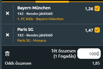 - 1.FC Köln – Bayern München: Mivel a Köln a tabella vége felé mocorog rendszeresen, a bajorok pedig a bajnokságért küzdenek, ez a mai meccs elég egyoldalú lehet. A Bayern számára motiváló lehet, hogy egy győzelemmel a tabella élére lépne, mivel a listavezető Bayer Leverkusen csak szombaton játszik. A Köln legutóbb 1-1-es döntetlent ért el a VfL Bochum ellen, ezzel elmozdult a tabella aljáról, de ma nem lesz kegyelem! Vendégsiker.