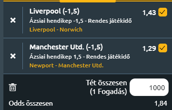 - Newport County - Manchester United: A Newport County hasít az FA Kupában, de alighanem most eljött nekik a vége. Graham Coughlan csapata a harmadik forduló visszavágóján 3-1-re legyőzte az Eastleigh-t, és ezzel álommeccset játszhat a Vörös Ördögökkel, akik a hónap elején 2-0-ra nyertek a Wigan Athletic ellen. Mindazonáltal a Newport County-t nem szabad lebecsülni a hazai közönség előtt, Rodney Parade-ék mindent meg fognak tenni azért, hogy abszolút esélytelenként meglepetést szerezzenek. Ten Haag azonban erős kezdőcsapatot fog a pályára küldeni és semmit nem bíznak a véletlenre. Ez pedig tükörsima vendégsikert jelent majd. Akár 0-1-es hendikepről is!