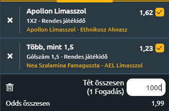 Apollon Limasszol - Ethnikosz Ahnasz: A cipursi bajnokság osztályozós playoff-csoportja, amit az Apollon vezet magabiztosan. Ebben a 8 csapatban magasan a legjobb védelme van az Apollonnak, ezért is furcsa, hogy csak ide kerültek be az alapszakaszból. Itt viszont nem lehet gond. Mivel legutóbb az AEL Limasszoltól kikaptak, me muszáj lesz nyerni az Ahnasz ellenében, amely hat ponttal kevesebbet szerzett és 28-cal több gólt kapott ugyanannyi meccsen! Ez nálam sima hazai!
