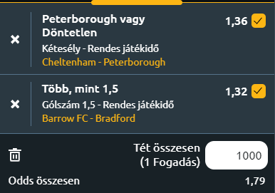 - Barrow - Bradford City: A Barrow-nak egy Bradford City-elleni győzelemmel lesz lehetősége arra, hogy bebiztosítsa helyét a League Two rájátszásában, de erre a vendégeknek is megvan az esélyük még. A két csapat ellentétes formát mutat, és mivel a Bradford lendületben van az öt meccsen aratott négy győzelem után, kifejezetten támadó focit várhatunk gólokkal! Legalább kettővel. Over 1,5 gól a meccsen.