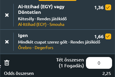 - Al Ittihad – Smouha: Az Al Ittihad a 4. helyen áll az egyiptomi bajnokságban, míg a Smouha csapata ugyanitt 8. Pontszámban csak néggyel vezet az Al Ittihad, viszont egy meccsel többet játszottak! Az Al Ittihad ritkán kap gólt otthon, jó a védelme, míg a Smouha támadási hatékonysága kifejezetten gyenge ha elhagyják otthonukat, hiszen 10 idegenbeli mérkőzésen mindössze 6 gólt szerzett. Ha az Al Ittihad ismét védekezően játszik ma hazai pályán, az óvatosságot tartva szem előtt, akkor itt egy unalmasabb meccset várhatunk, ahol nem kap ki a hazai csapat! Tipp: 1X