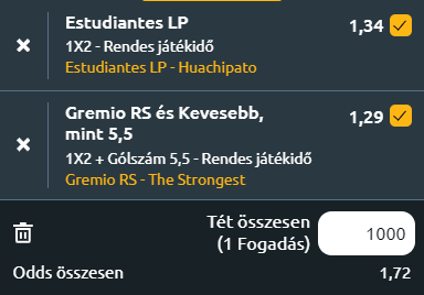 - Gremio - The Strongest: Egy hónap kihagyás után a Gremio a bolíviai The Strongest fogadja. Komoly minőségi különbség van a csapatok között, de az időjárás miatt a Gremio nem a saját stadionjában lép pályára, hanem a curitibai Estadio Couto Pereira stadionban szerepel. A minőségi különbség miatt a Gremio nagy favorit, de egyrészt egy hónapja nem tudtak pályára lépni, és ma semleges pályán kell játszani. Nem fogják kiütni a Strongest! HAZAI + KEVESEBB MINT 5,5 GÓL