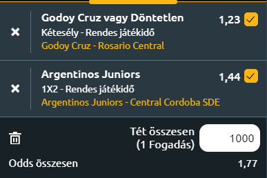 - Godoy Cruz - Rosario Central: A Godoy Cruz az argentin Primera Division ötödik játéknapján még mindig nyeretlen Godoy Cruz hazai pályán próbálja megszerezni első győzelmét a Rosario ellen. Legutóbb az Estudiantes ellen játszottak 1-1-es döntetlent. A védelem jó, de a támadási hatékonyság lehetne jobb is. A Rosario is döntetlent játszott legutóbb, az elmúlt hetekben rendre küzdenek, harcolnak, de a győzelem nem lett meg. A Godoy védelme jobb, mint a vendégeké, valamint a hazai pálya előnye is őket segíti. Ha most sem jönne össze a győzelem, a döntetlen meglesz. 1X a tipp.