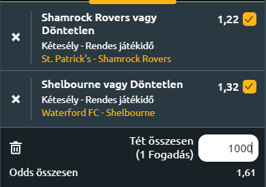 - Waterford FC – Shelbourne: A hazai csapat negyedik helyen áll a bajnokságban, az elmúlt hat meccsükön 12 pontot gyűjtöttek, míg a vendégek 13 pontot szereztek ugyanebben az időszakban és első helyen állnak. A Waterford a 3. helyért küzd. Keith Long csapata kezdetben nehezen indult, az első 12 meccsükön csak három győzelmet arattak, így nyolcadik helyen álltak, de a közelmúltbeli javulásnak köszönhetően már holtversenyben vannak a harmadik helyezett Shamrock Roversszel 20 forduló után. A Waterford fantasztikus sorozatot produkált, az utolsó nyolc mérkőzésükből hatot megnyertek, és ezzel az egyik legjobb formában lévő csapatként érkeznek a listavezető elleni mérkőzésre. A hazai pályán kicsit jobban teljesítenek, a 31 pontjukból 17-et otthon szereztek, de legutóbb 2017 májusában győzték le a Shelbourne-t hazai pályán az első osztályban. A vendégek, Shelbourne, idén a legjobban teljesítenek idegenben, 10 idegenbeli mérkőzésükön 19 pontot gyűjtöttek, és eddig csak a Galway United ellen szenvedtek vereséget. Damien Duff csapata a szezon elején kilenc meccsen maradt veretlen, ebből hat győzelem volt, majd április közepén két egymást követő vereséget szenvedtek el. Bár a Waterford jelenleg az egyik legjobb formában lévő csapat a ligában, a Shelbourne idegenbeli teljesítménye idén a legjobb az egész bajnokságban, ezért az X2-re voksolok.