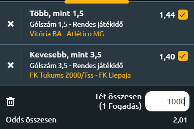 - Vitoria - Atletico Mineiro: A Vitoria lendületesen támad, jó góllövői vannak, viszont a védelem is gólképes hátul! Ezt tökéletesen alátámasztja az a tény, hogy a Vitoria legutóbbi hét mérkőzéséből ötön mindkét csapat szerzett gólt! Az Atletico MG egy olyan gárda, amely idegenben is bátor támadójátékot alkalmaz, náluk ekkor is elsődleges a gólszerzés! Ezt pedig az támasztja alá kitűnően, hogy az Atletico MG az utolsó 11 idegenbeli meccséből tíz alkalommal legalább egy gólt szerzett. Ha pedig az egymás közti meccseket vizslatjuk a múltban, akkor elmondható, hogy az előző hat találkozóból ötöt a Vitória nyert meg. Mindebből tökéletesen levonható az a következtetés, hogy minimum két gól várható!