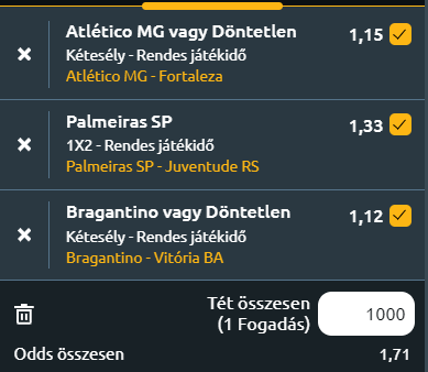 - Palmeiras – Juventude (3.-11.): A két kétesély mellé egy erősebb fixes meccs következik. A regnáló bajnok Palmeiras zsinórban ötödik győzelmét szeretné megszerezni, amikor vasárnap az Allianz Parque-ban fogadja a Juventude csapatát. Bombaformában vannak a hazaiak és a két gárda között szignifikáns különbség van. HAZAI.