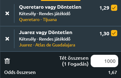 - Juarez – Atlas: Az Apertura első forulójában a Juarez hazai körülmények között fogadja az Atlas csapatát. Mindkét fél célja egy jobb szezon lesz, miután az előző idényben csalódást keltő szezont futottak. A házigazdák nem jutottak be a rájátszásba sem az Aperturában, sem a Clausurában, míg a vendégek mindkét bajnokságban a tabella leghátsó traktusában végeztek. Idén is lesz különbség közöttük, de ma ez szoros meccs lehet! A hazai mellett a döntetlent is figyelembe kell venni. 1X