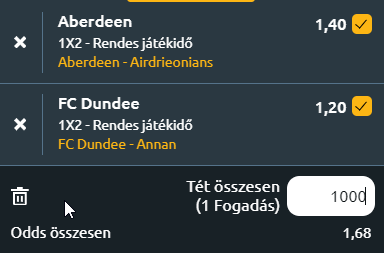 - Aberdeen – Airdrieonians: Az Aberdeen a csalódást keltő 2023-24-es szezon során a harmadik helyről a kilencedikre estek vissza, de a Ligakupában a döntőig jutottak, ahol végül büntetőkkel kaptak ki a Celtic ellen. Az edzőváltások után Jimmy Thelin lett a csapat új menedzsere. A 2024-25-ös bajnoki szezon még nem kezdődött el, de Thelin vezetésével az Aberdeen már két meggyőző győzelmet aratott a Ligakupában, 3-0-ra nyertek a Queen of The South ellen és 5-0-ra az East Kilbride ellen. A vendég Airdrieonians csoportelső az East Kilbride elleni 8-0-s és a Dumbarton elleni 4-3-as győzelmüknek köszönhetően. Rhys McCabe csapata idegenben gyengébben teljesít, de a két meccsen szerzett 12 góljuk bizakodásra ad okot. Az Aberdeen kerete jóval masszívabb, minőségibb. Ehhez jön a hazai pálya előnye. Hazai győzelem várható.