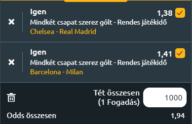 - Real Madrid – Chelsea: Egyik csapat sincs még topformában, ezt az eddig lejátszott barátságos meccsek is mutatják. Enzo Maresca csapata a hétvégén négyet kapott a Manchester Citytől, míg a regnáló BL-győztes 2-1-es vereséget szenvedett az amerikai El Clasicón a rivális Barcelonától. A Chelsea igen sok védelmi hibával játszott, amit a ManCity büntetett és nem lesz egy csapásra betonretesz a hátsó sor. A Real Madrid hátsó alakzata sem volt olyan hajde, ráadásul Ancelotti csapatából sokan hiányoznak a nemzetközi megmérettetések miatt. Viszont a támadósor extra! Gólváltást várom és a bátrak még a Real-győzelmet is bekombinálhatják. MINDKÉT CSAPAT GÓL